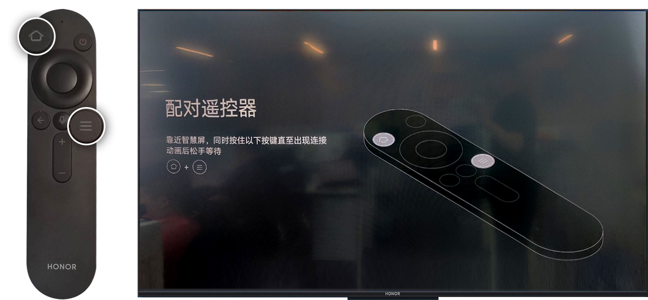 如果更换了遥控器,将智慧屏断电重启后,同时按住新遥控器主页键