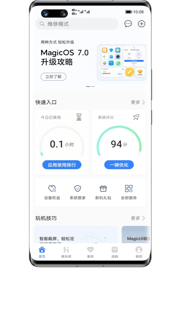 进入我的荣耀APP后,点击首页的升级尝鲜按钮或快速入口的系统更新,进行软件更新。