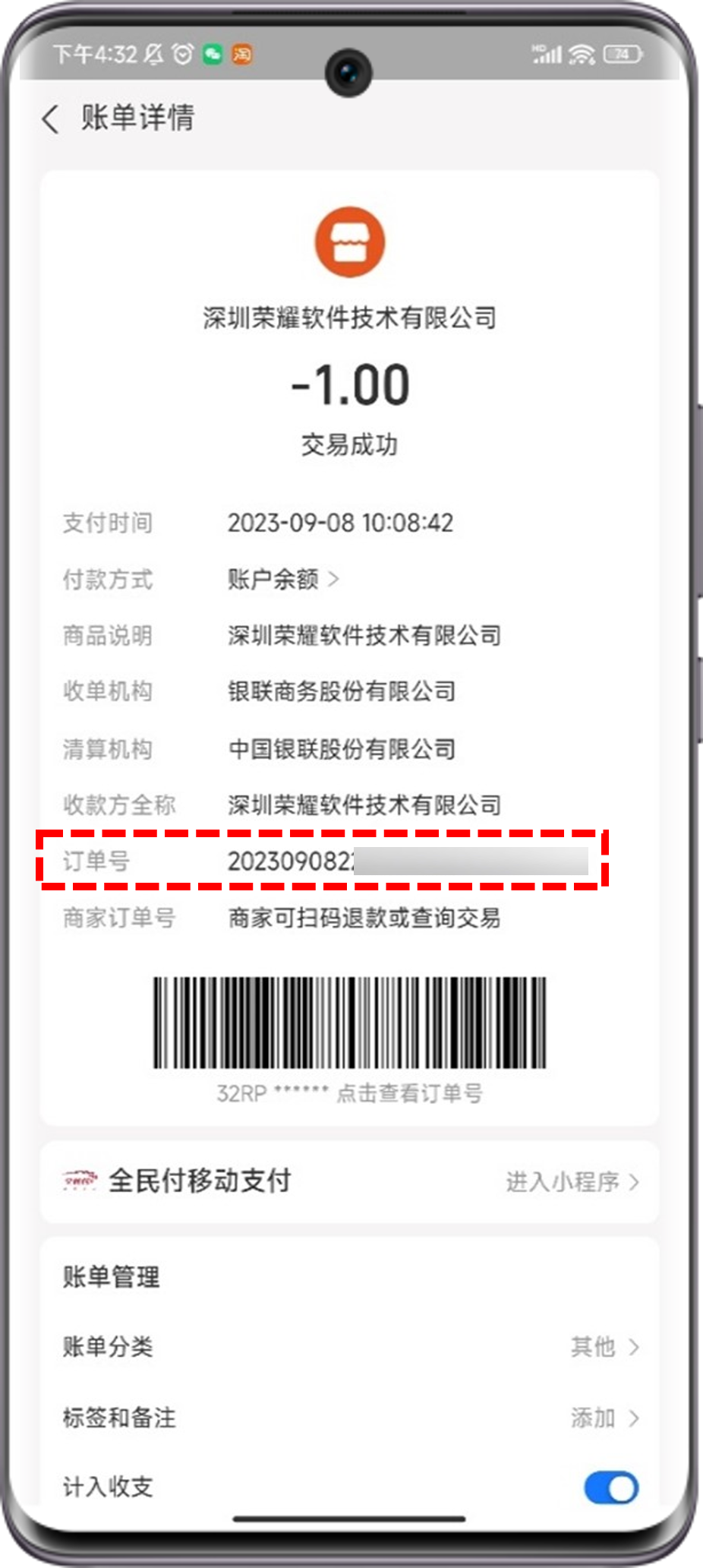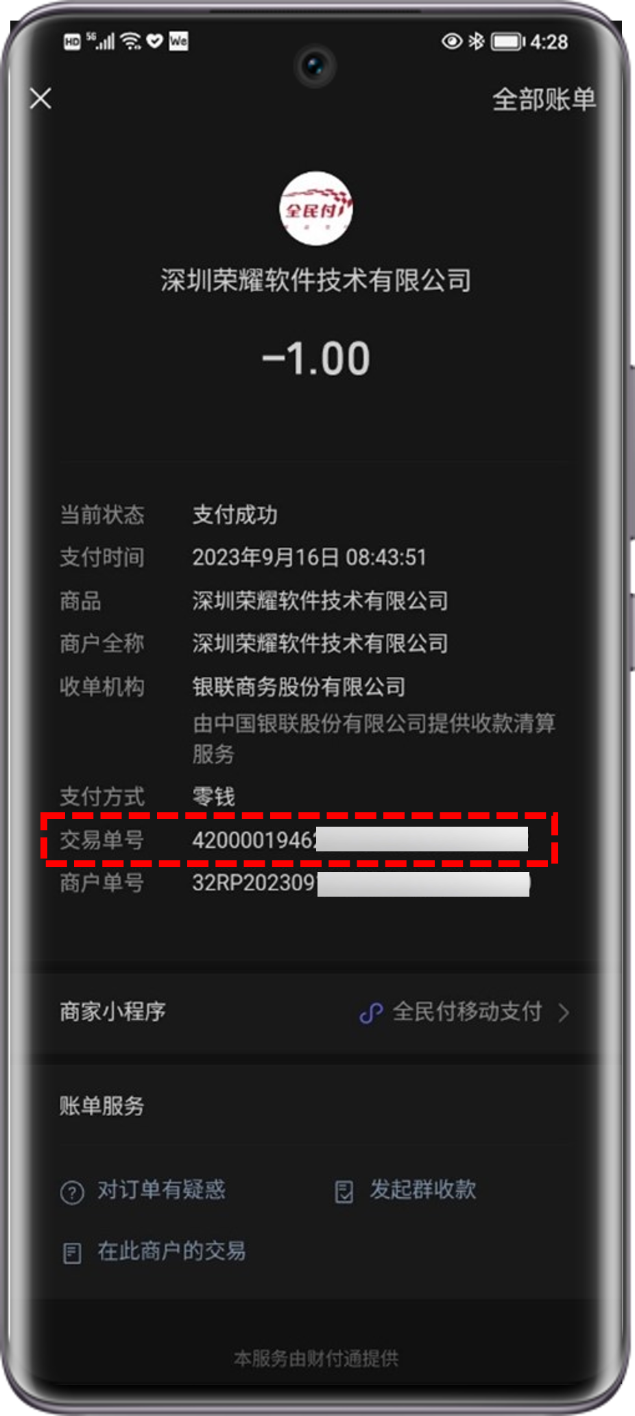 微信:我>服务>钱包>账单>任一笔荣耀订单>交易单号