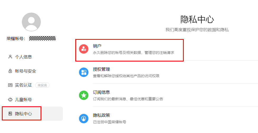 网页端:您可以通过荣耀商城官网点击登录 > 账号中心 > 隐私中心 > 销户,根据提示操作。