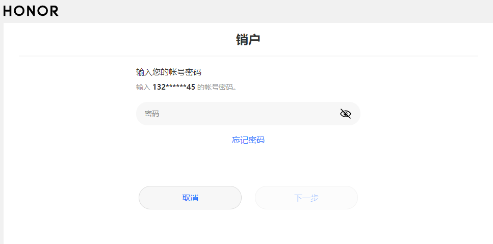 温馨提示:账号一经注销,您将不能使用该账号访问我的荣耀、荣耀商城、荣耀亲选、荣耀俱乐部等服务,该账号内的所有个人数据将被清除,无法恢复。个人数据包括但不限于:个人信息、上传的文件、交易记录等。注销后账号将立即失效,请您谨慎操作。