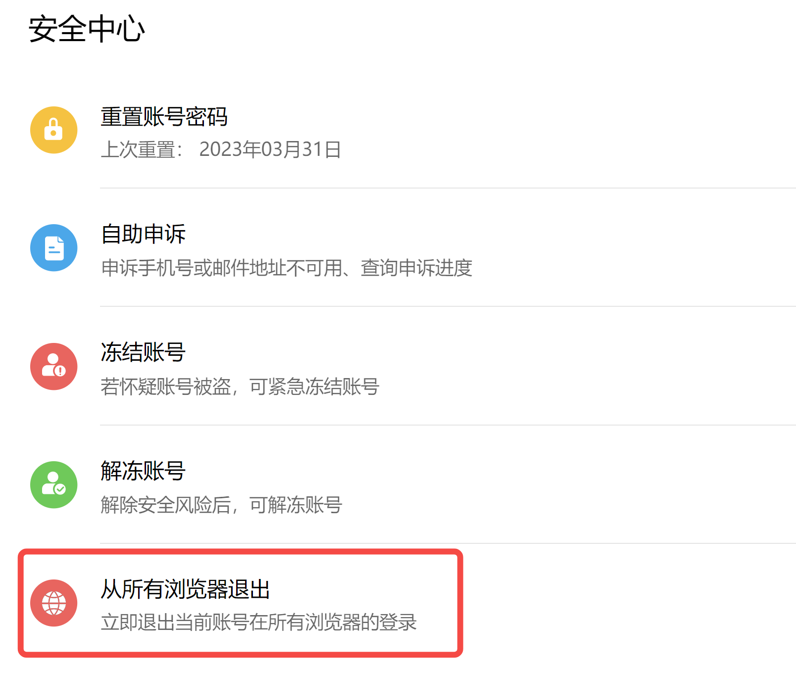 网页版荣耀账号中心支持从所有浏览器退出账号登录,不支持退出设备上的登录。如需退出其他设备上的账号登录,请在荣耀手机/平板上操作。