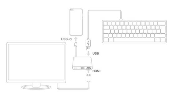 2. 将扩展坞USB-C接口连接手机或平板端,USB接口连接键盘,HDMI接口连接显示器。